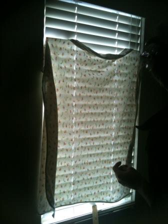 I'm adding to this by also trying to complete odd jobs that have been abandoned because I got distracted, or overwhelmed. This little window in the nursery nook is a good case in point. A bunny rug clipped to the venetians was really no longer doing it for me. I had meant to make trousers for Thom Womble out of this fabric but got freaked out by the level of difficulty and the cutting of such beautiful linen. I needed a metre of polar fleece for the trousers and the linen could be used for the curtain.
